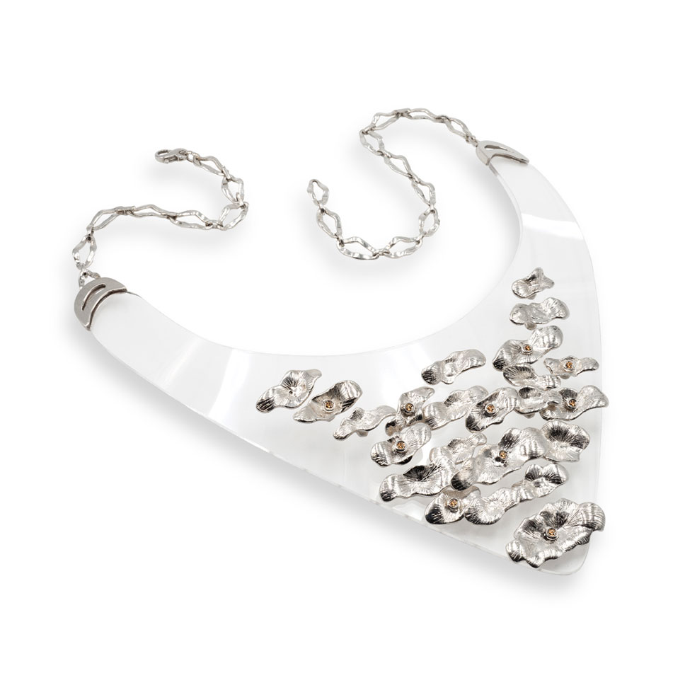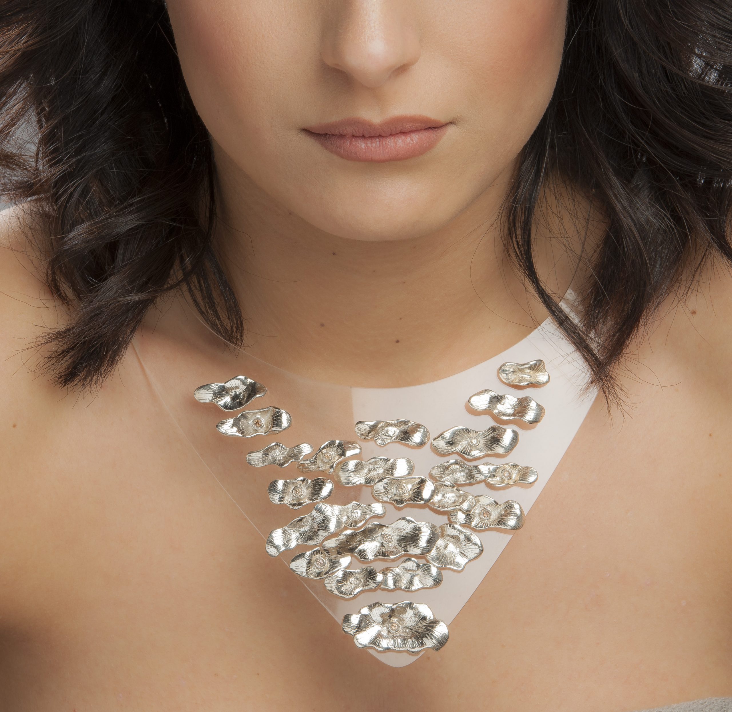 Argento 925, Diamanti Naturali Brown, Plexiglas. Prodotto Artigianalmente in Italia. La Collezione Leaves si ispira alle robuste e magiche foglie del fiore di loto che dall’acqua si innalzano verso il cielo danzando e sfidando il tempo e le tempeste. Il collier della Collezione Leaves è come una seconda pelle da indossare. La struttura rigida e trasparente del plexiglas fa da diaframma per le cangianti foglioline, ognuna diversa dalle altre. L’argento e i diamanti brown illuminano ed impreziosiscono lo stile. Realizzata in cera persa anche la catena regolabile.